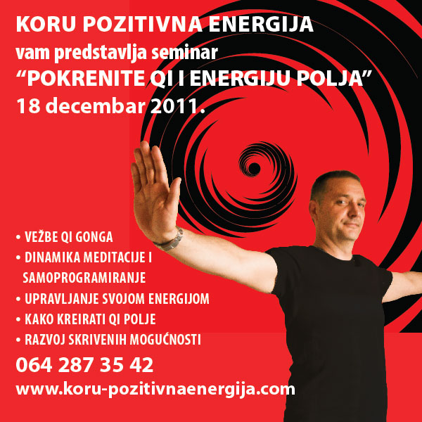 Pozivam sve zainteresovane koji žele da nauče ili da se bolje upoznaju sa tehnikom Qi Gonga da nam se pridruže na seminaru koji ćemo održati 18. decembra. Ovo će biti poslednje druženje u ovoj godini, što smatram najboljom pripremom za novu 2012. godinu. Program seminara je pogodan za sve. Osim vežbi Qi Gonga, naučićemo šta je meditacija i vežbati nekoliko različitih metoda vezanih za taoističku tradiciju kao i specifične meditacije iz Qi Gonga. Otkrićemo tajne stvaranja Qi Polja, ubacivanje informacija koje nam mogu promeniti život na bolje i saznati kako i zašto naše misli kreiraju našu stvarnost.