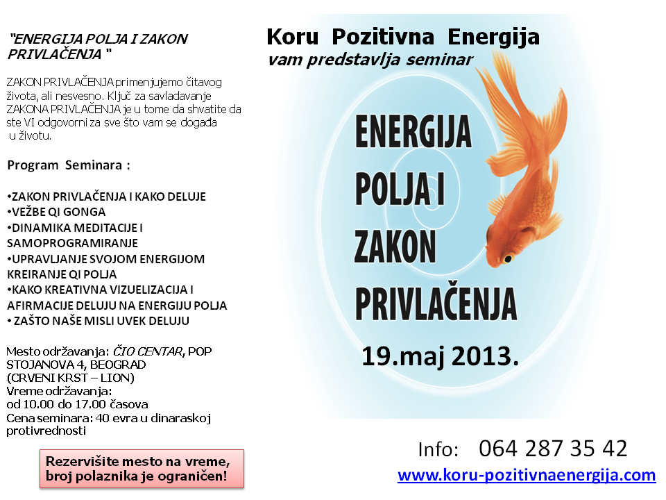 Pozivam sve koji žele da nauče i bolje upoznaju sebe i svoje mogućnosti da nam se pridruže na seminaru koji ćemo održati 19.maja. Program seminara je pogodan za sve koji žele da promene život na bolje i da ga samostalno i svesno kreiraju. Osim vežbi QI GONGA, naučićemo šta je meditacija, vežbati nekoliko različitih metoda vezanih za taoističku tradiciju kao i specifične meditacije iz QI GONGA. Otkrićemo tajne stvaranja QI POLJA i ubacivanje informacija koje nam mogu promeniti život na bolje, saznavši kako i zašto naše misli kreiraju našu stvarnost.